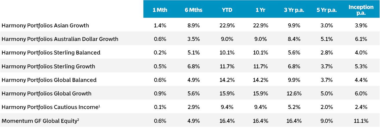 Source: Bloomberg Finance L.P., Momentum Global Investment Management. Returns to 31 December 2025, net of fees in base currency terms. Past performance Is not indicative of future returns. 1Harmony Cautious Income Portfolio inception date of 25 January 2019. 2Historical performance, figures prior to 12 June 2020, when Momentum IF Global Equity Fund (MIF GEF) merged into the UCITS structure to combine with Momentum GF Global Equity Fund (MGF GEF), comprises three components: i) between 28 February 2009 and 16 December 2019 performance figures reflect MIF GEF A; ii) between 16 December 2019 and 9 January 2020 the performance figures are a composite of MIF GEF A and MGF GEF I on an asset-weighted basis; iii) between 9 January 2019 and 11 June 2020 the performance figures are a composite of MIF GEF I and Harmony Global Equity Fund A (Harmony GEF) on an asset-weighted basis. Historical performance figures for MIF GEF A and MGF GEF I have been adjusted to incorporate the prevailing fees for Harmony GEF.